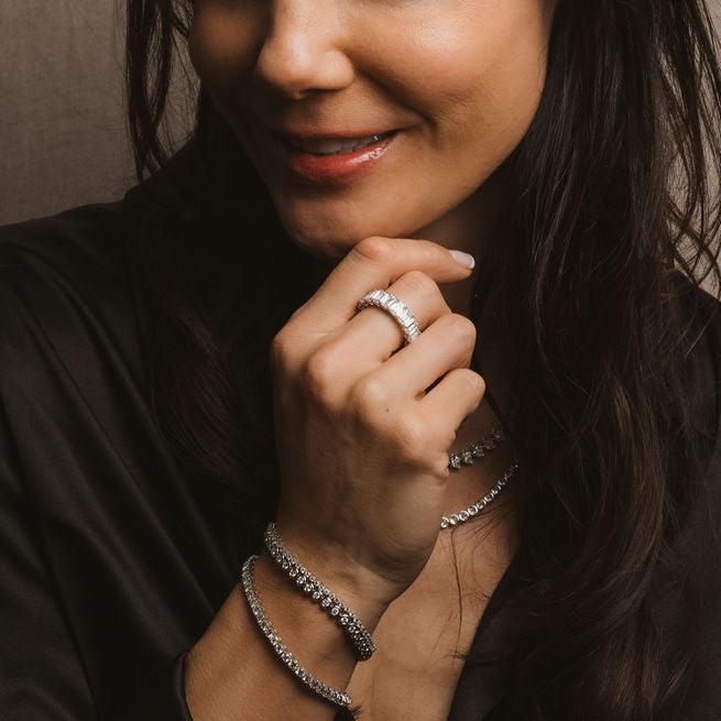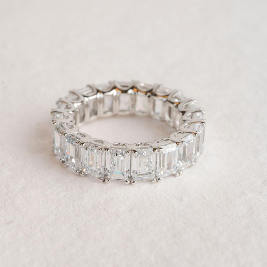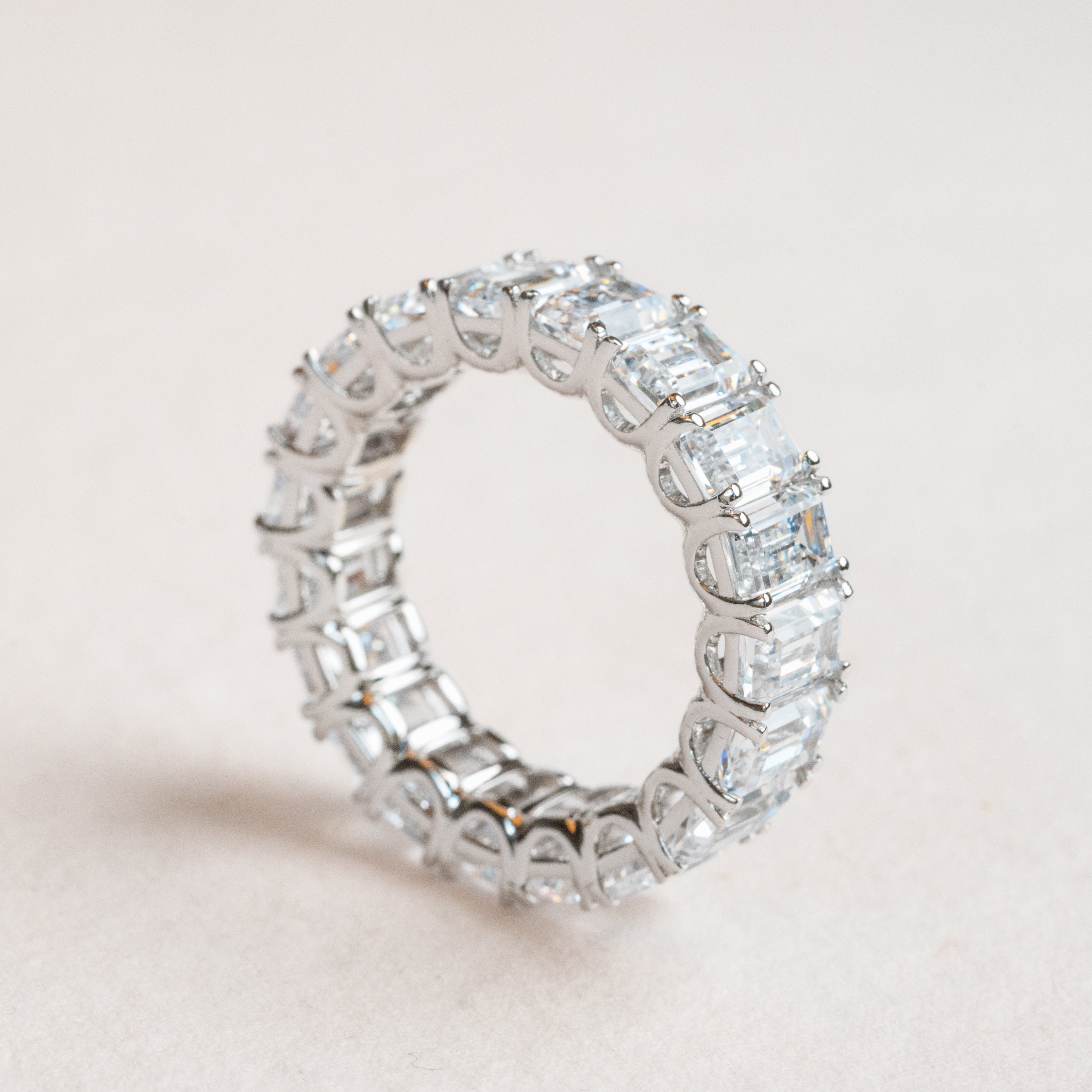 The Kensington Eternity Ring is a true masterpiece, showcasing an extraordinary 14 carats of radiant emerald-cut lab-grown diamonds. Each ring is meticulously custom-crafted to your exact size, guaranteeing a flawless fit and an exquisite, personalised design that embodies modernity and style.