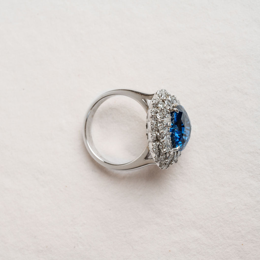 THE BUCKINGHAM HEART-SHAPED DIAMOND HALO RING, CRAFTED WITH A 5CT LAB-GROWN BLUE SAPPHIRE, SET IN PLATINUM OR 18CT GOLD BY J ROCKS LONDON