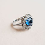 This statement ring showcases a heart-shaped lab-grown blue sapphire centre stone. Surrounded by a stunning triple halo of pear and round VS colourless lab-grown diamonds, it offers sophistication and style.